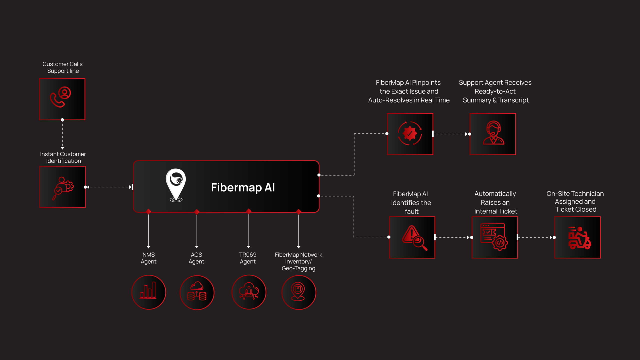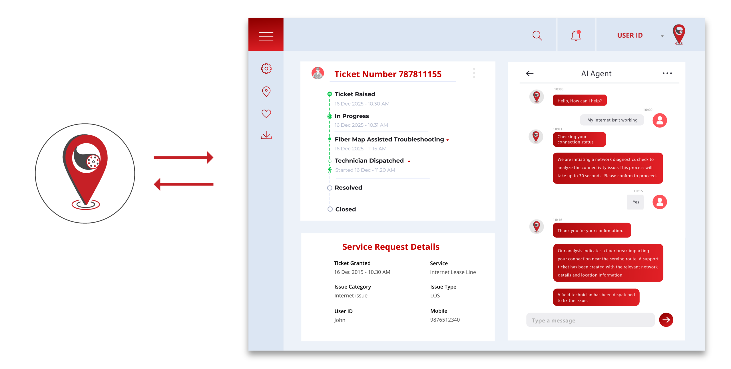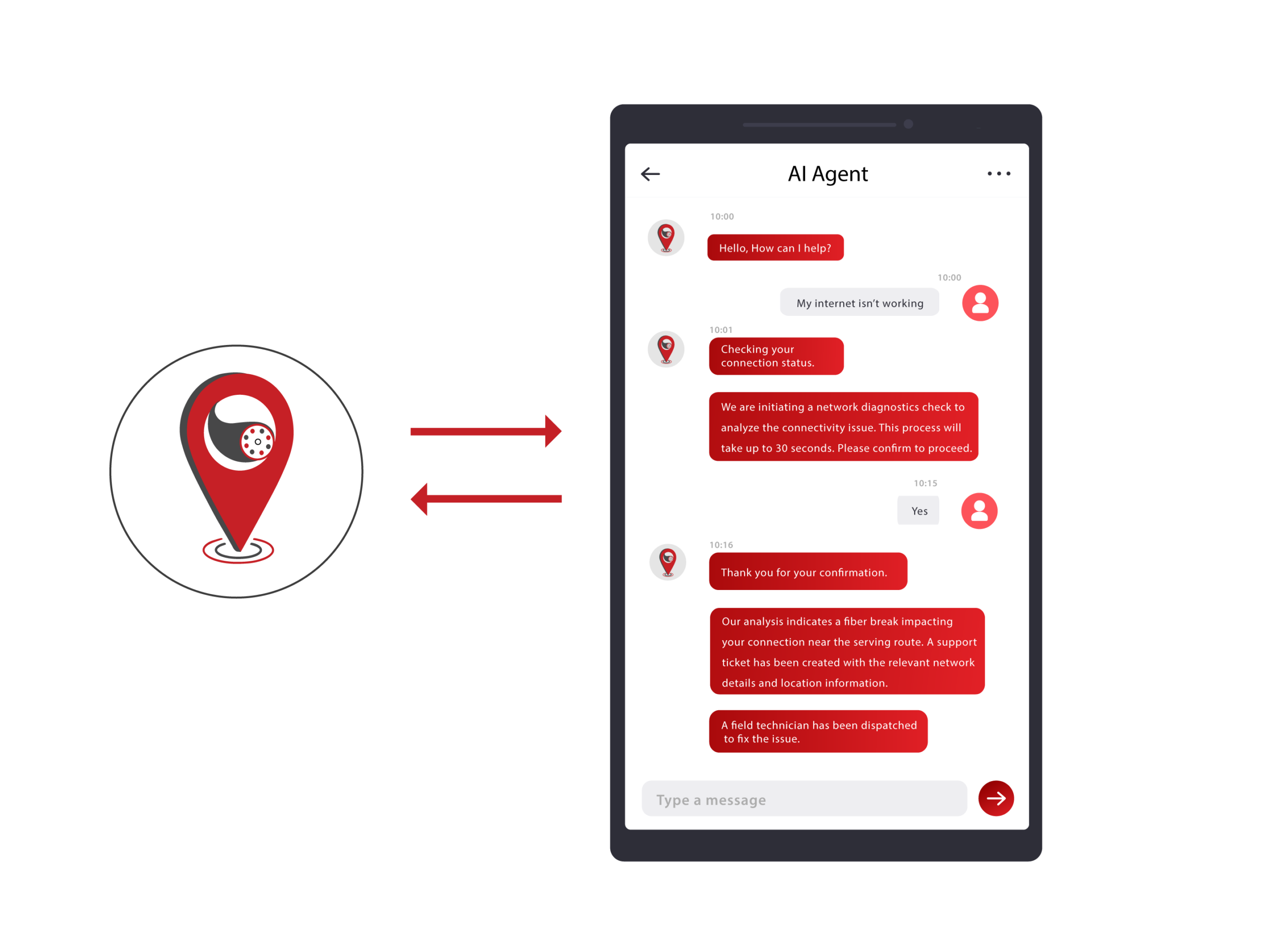 Customers interact with an AI-powered chatbot that directly connects to FiberMap AI. Instead of just collecting complaints, the chatbot triggers real-time diagnostics to identify network faults and initiate corrective actions automatically.